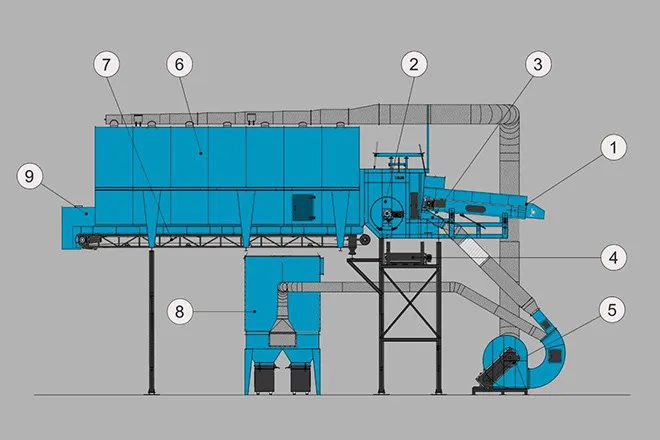 regulation valves. Behind the charge conveyor an expansion room with a rotating drum (2)
